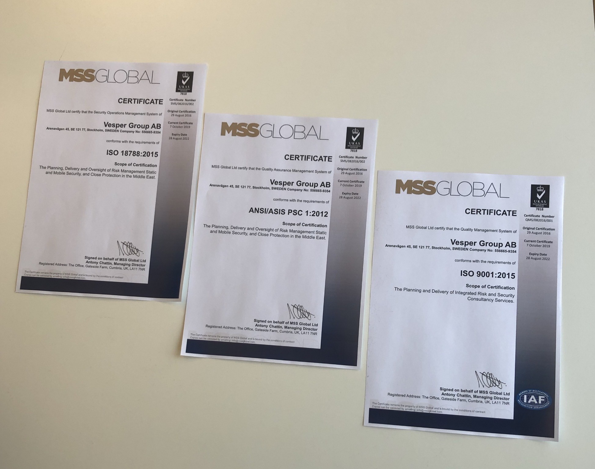 Förnyade ISO-certifieringar för Vesper